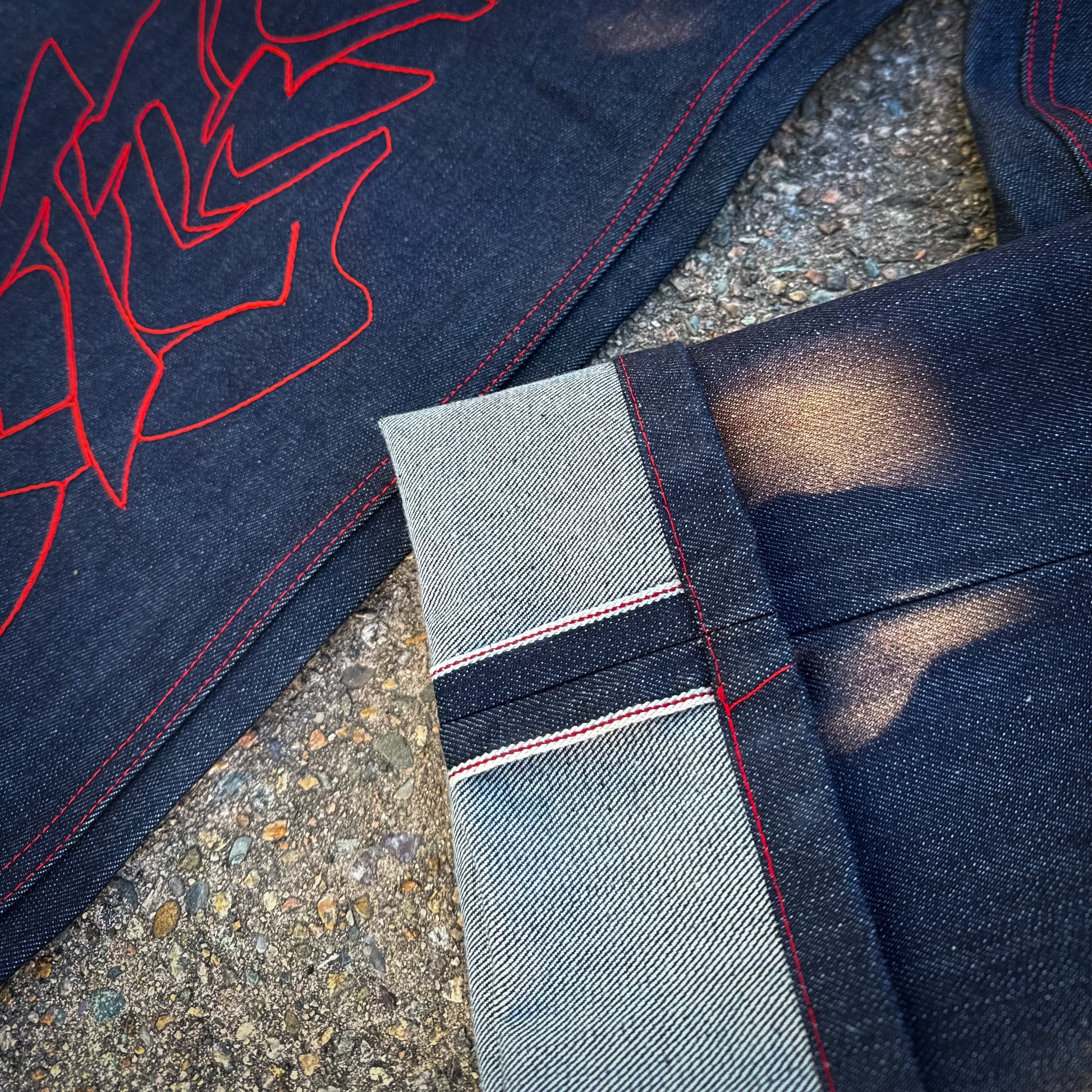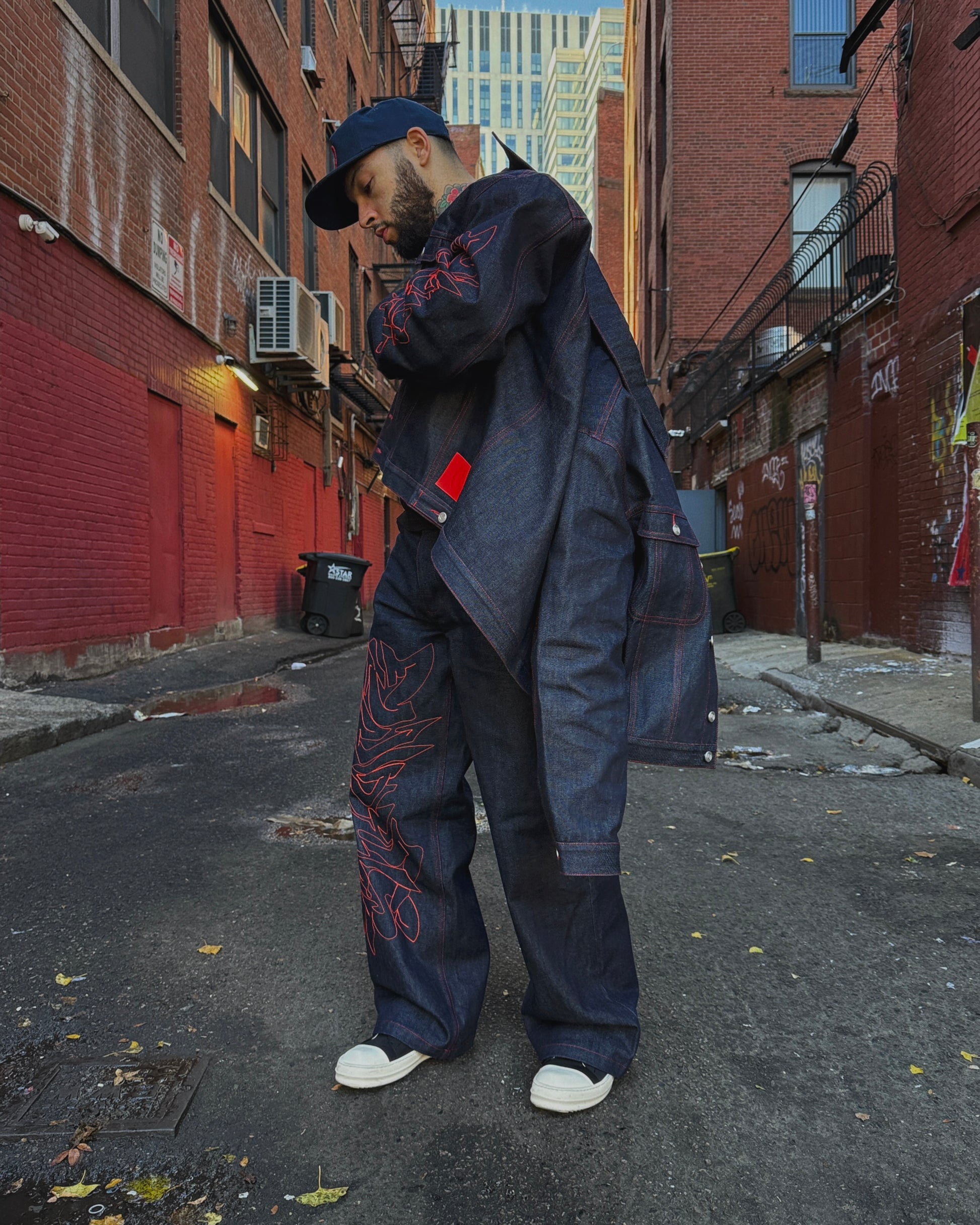 Finished with bloodline stitching throughout — a custom red contrast stitch that runs clean and deliberate — and red chain-stitch embroidery as a signature mark. Each detail is meant to stand out without begging for attention.