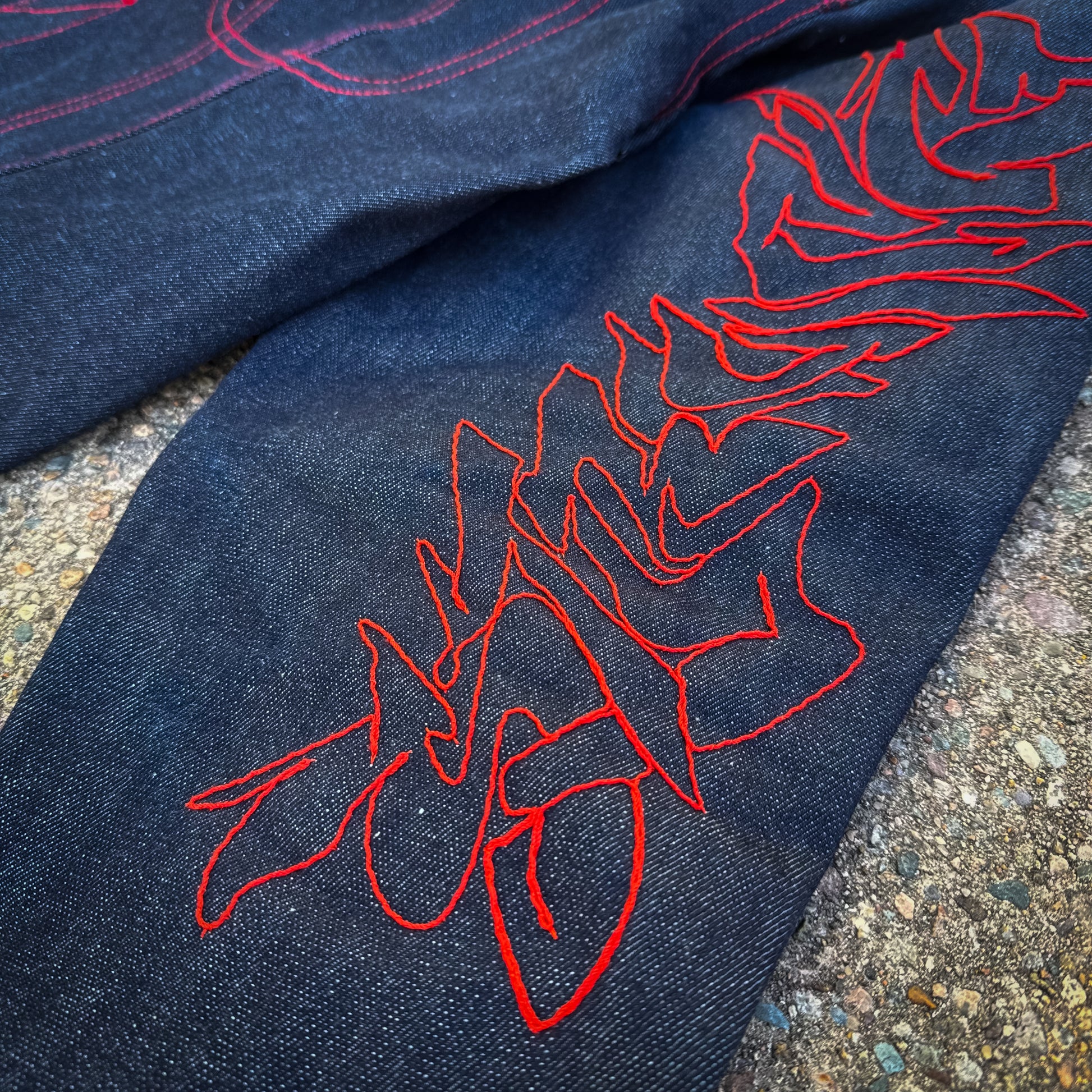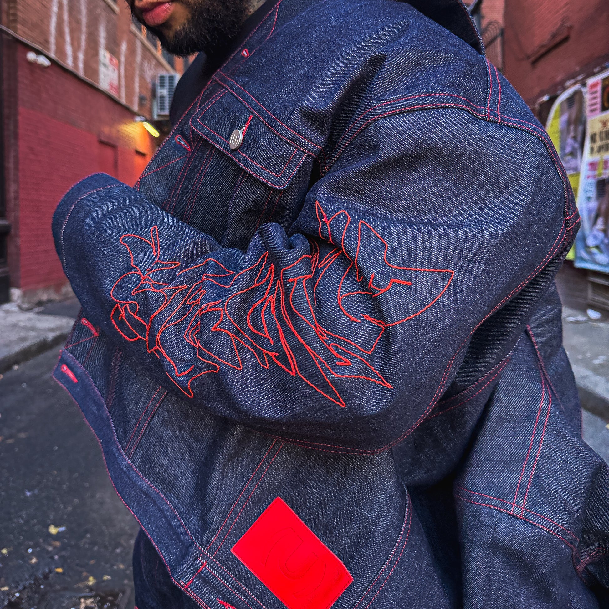 Finished with bloodline stitching throughout, using a custom red contrast thread that defines every seam without overpowering the silhouette. Red chain-stitch embroidery runs as a signature detail, adding controlled tension against the clean lines of the jacket.